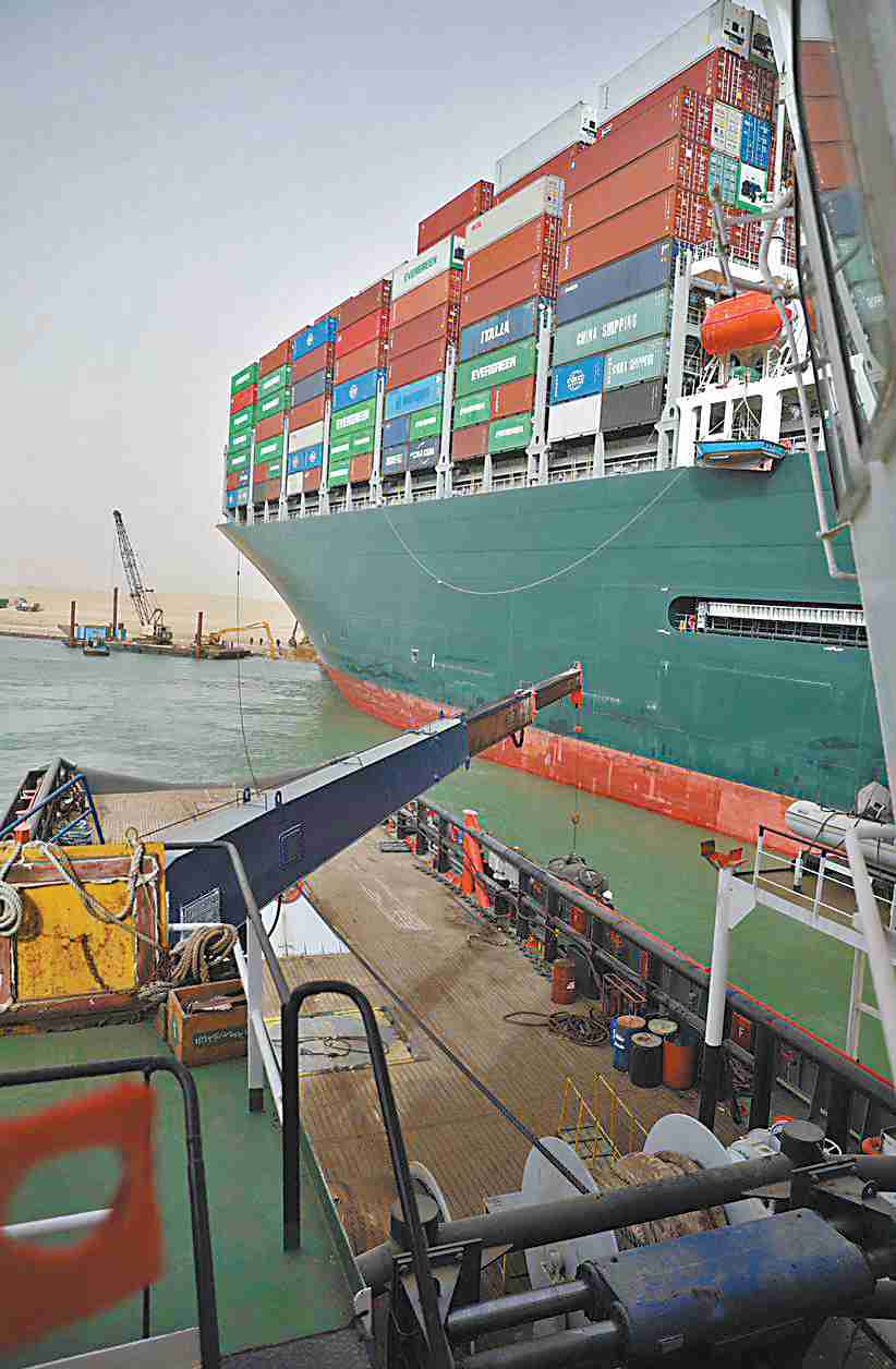 当地时间25日,多艘拖船正努力对“长赐”号货轮进行救援。