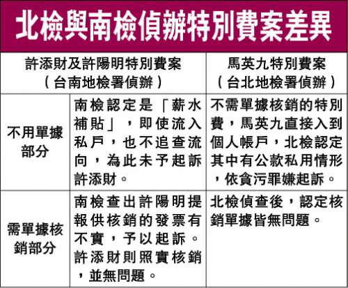 社论指出,“特别费”分成“领据核销”和“单据核销”,性质有所不同;领据核销部分应视为首长实质补贴,这是目前地院和高院两个审级,至少是南检检察官所持的见解。但是,侯宽仁等特侦组部分检察官坚持己见,于是除了马英九面临检方可能上诉、继续打三审官司的境遇外,其他首长的“特别费”案就全看由那一位检察官侦办了;幸运的不起诉结案,不幸的就缠讼不止。这种执法标准不一,造成当事人各凭运气的状况,无论如何都是极不正常的状态。稍有责任感的检察总长,绝不可容许这种状态继绩下去,否则就是废弛职务,岂可将“统一见解”的责任推给最高法院?