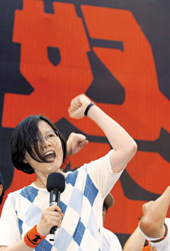台湾社8月30日举办“百日怒吼、全民站出来”游行,民进党主席蔡英文带领党务主管高喊口号。(图片来源:台湾《联合报》)