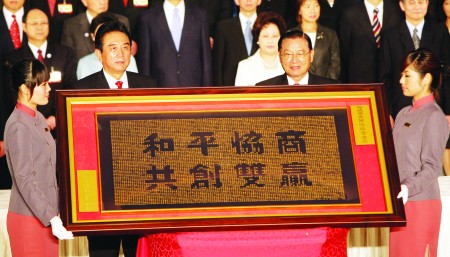 11月4日陈江会谈后,江丙坤向陈云林赠送了一幅书写着“和平协商、共创双赢”的镂空书法。