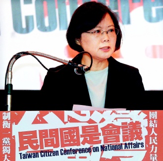 台湾“民间国是会议”上,民进党主席蔡英文致词时重炮批评马英九当局,再度要求撤换“内阁”。(图片来源:台湾《联合报》)