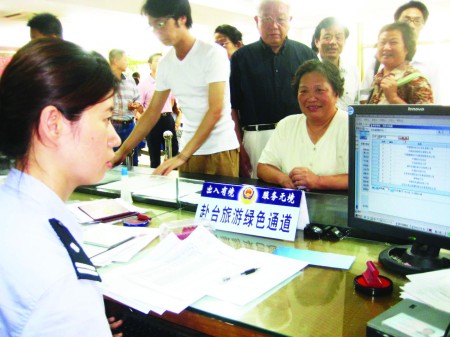 2008年7月14日,青岛市出入境管理局,“赴台旅游绿色通道”前台民警正在为申请赴台游的居民办理手续。