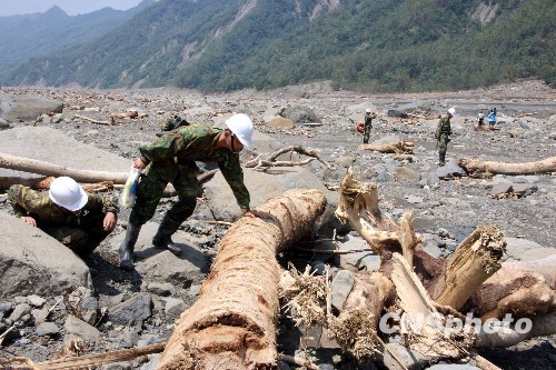 台湾高雄县甲仙乡小林村在“88水灾”中遭遇泥石流。图为8月19日,官兵在现场搜索,不放过任何一个角落。(图片来源:中新社)