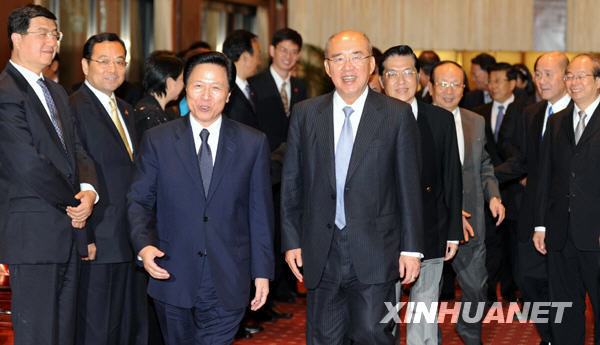11月9日,中国国民党荣誉主席吴伯雄(中右)在台北会见应国民党中央邀请率团来访的中共江苏省委书记梁保华(中左)。(图片来源:新华社)