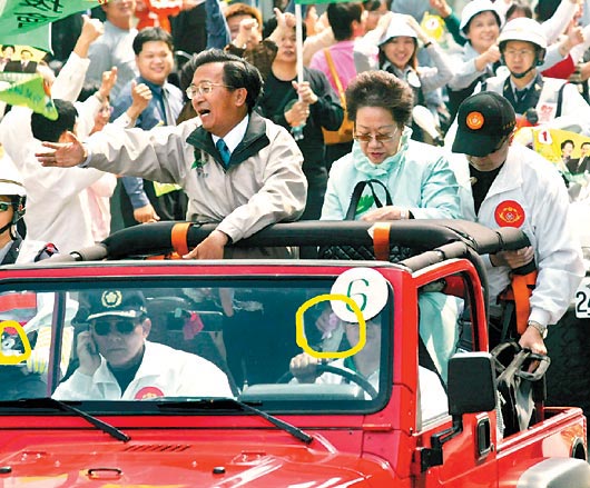 台湾“监察院”319枪击案调查报告出炉,指出第一枪打的是吕秀莲。吕秀莲当时在吉普车上低头用手帕压住流血的脚(大圈),左侧吉普车窗有子弹射入的痕迹(小圈)。(图片来源:台湾《联合报》)