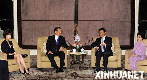 11月14日,中共中央总书记胡锦涛和夫人刘永清在新加坡会见中国国民党荣誉主席连战和夫人连方瑀。(图片来源:新华社)