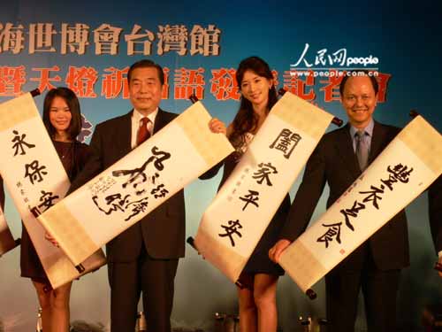 2010年1月28日,上海世博会台湾馆亲善大使暨天灯祈福语发表记者会在台北举行。图为台北世贸中心董事长王志刚(左二)、台湾馆代言人林志玲(左三)等展示天灯祈福语。(图片来源:人民网)