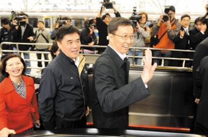 4月7日,率团到台北访问的上海市长韩正在台北市长郝龙斌(左二)的陪同下搭乘台北捷运淡水线。图为韩正向搭乘捷运的台北市民挥手致意。