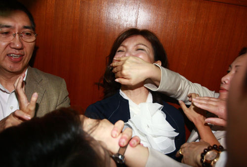 台湾立法机构21日审查关于开放大陆学生来台就学的“陆生三法”。教育主管部门及大学校长纷纷表示支持,民进党民代则激烈反对。图为绿营民代捂住国民党民代赵丽云(中)的嘴阻挠会议进行。