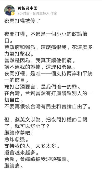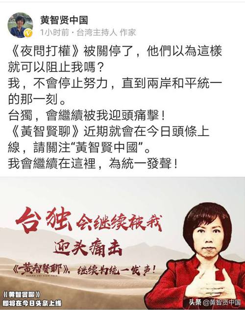 6月27日下午,黄智贤继续在网络平台发文,宣布新节目《黄智贤聊》近期将会上线,她会继续为统一发声。黄智贤还表示:蔡英文以为把《夜问打权》关了就可以阻止我吗?支持我的人太多太多,还会越来越多,我不会停止努力,直到两岸和平统一的那一刻,“台独”会继续被我迎头痛击!