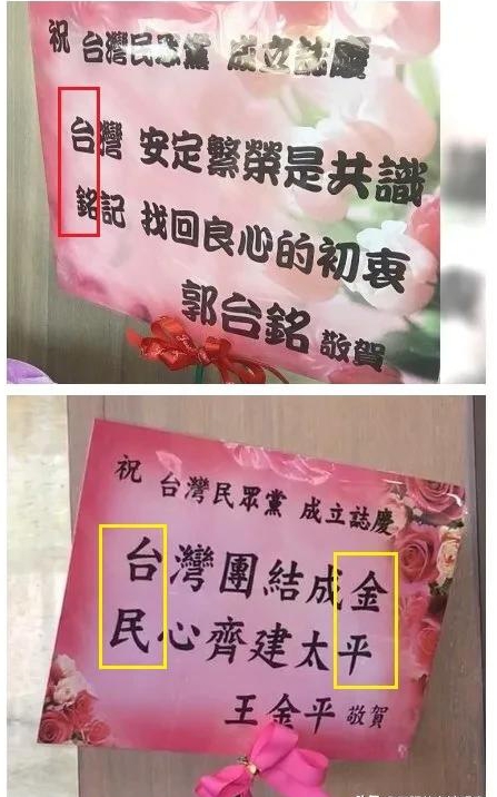 党名引发的第二个关注点,是“台湾民众党”一度被舆论叫成了“台民党”,谐音“台铭党”,这在选举敏感期的当下,不能不引发一些看上去有些无厘头的联想。参加国民党初选失利的郭台铭,近期一直被传将离开国民党与柯文哲合作参与2020年选举,难道取名“台铭党”是在向郭董示好?当然,这种猜想漏洞太多,毕竟还有一位也与柯文哲关系“暧昧”的国民党大佬,就是王金平。这不,台湾民众党创党大会的当天,郭台铭和王金平都送了花,而且两人的花篮就摆在大门左右两侧最醒目的位置,郭台铭的花语是以“台铭”藏头,王金平的花语以“台民”藏头、以“金平”藏尾,这样如果都不能引发外界联想的话,也太不现实了。