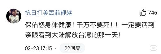 对于李登辉此次入院,大陆网友也“十分关切”。不少网友在留言中表示,希望台湾方面能够对其全力抢救,而理由则是一定要让这位老牌“台独”分子,亲眼目睹祖国统一的到来。