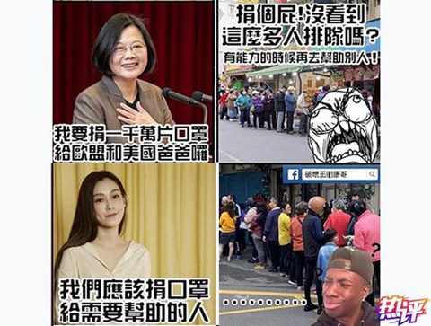 那么,现在台湾岛内口罩短缺的问题解决了吗?当蔡英文宣布向疫情严重的国家捐赠1000万个口罩,包括,除向美国每周捐赠的10万个之外再追加的200万个,向欧盟国家捐赠的700万个,以及捐给“友邦”的100万个。此外,还有“新南向”国家也有份……对此,岛内网友抛出了下面这张图表明态度: