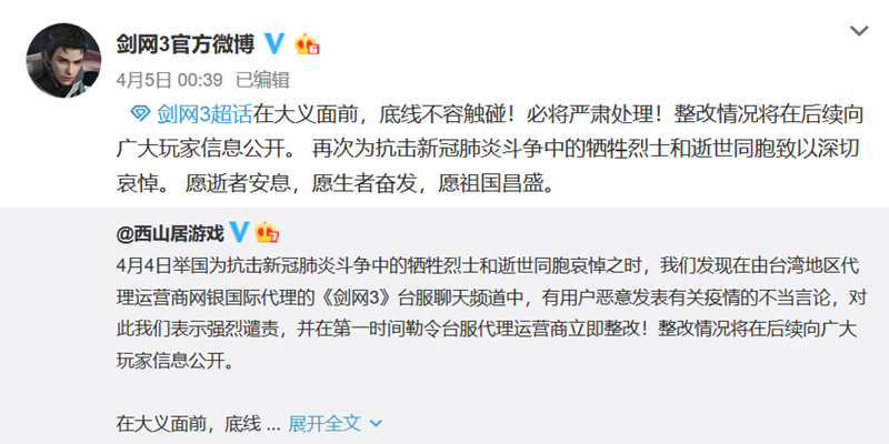 可能很多网友都没注意到,这个清明假期,游戏圈出了一件大事。在清明全国哀悼日期间,部分台湾网友在大陆开发的游戏“剑网3”里面肆意辱骂,发表“武汉肺炎”等不当言论,最终“剑网3”官方宣布停止台湾服务器。