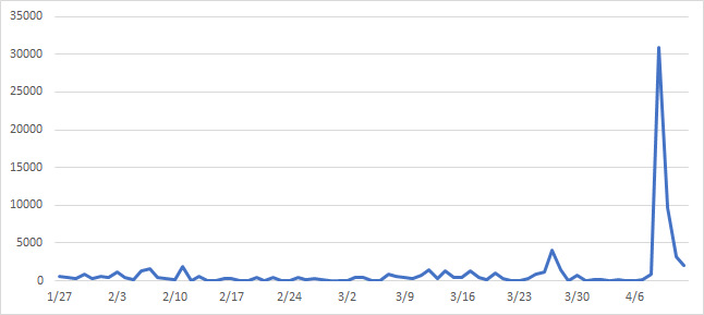 1月27日-4月12日谭德塞在台湾最大的网络论坛PTT的分日网络声量(图片来源:中评社)