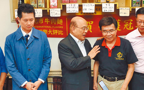 针对行政部门发言人丁怡铭发言引发牛肉麵风波,台行政部门负责人苏贞昌(中)日前带着丁怡铭(左)前往皇家牛肉面店用餐,向老板(右) 表达歉意。(图片来源:网络)