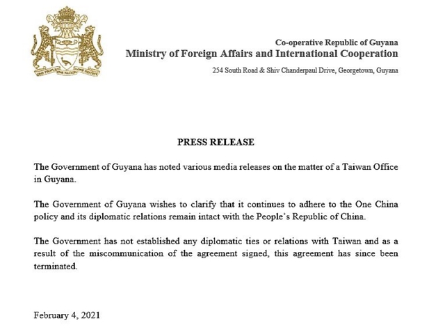 台当局外事主管部门4日宣布在圭亚那设立“台湾办公室”,岛内绿营媒体对此宣扬为“外交又一新突破”。然而,他们自嗨不到24小时就被打回原形。圭亚那外交部随后回应称,圭亚那政府并未与台湾建立任何“外交关系”,并宣布,基于对所签署协议的“沟通不良”,将终止这项协议。尽管被圭亚那官方泼了冷水,但是他们还没死心。