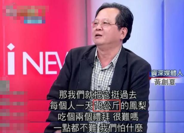 在这起“菠萝事件”当中,最令大陆网友印象深刻、跌破眼镜的,恐怕是岛内绿营各家“名嘴”的一系列名场面。比如,资深媒体人黄创夏所谓的“18公斤凤梨论”,“每人每天18公斤,连续吃两个星期,很难吗?”。该言论“振聋发聩”,一言既出,立即成为火遍两岸互联网的“爆梗”。