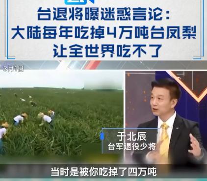 比如被称为“土房哥”的台军退役将领于北辰称“之前的台湾凤梨都被大陆吃掉,世界其他地方都没法享受”;
