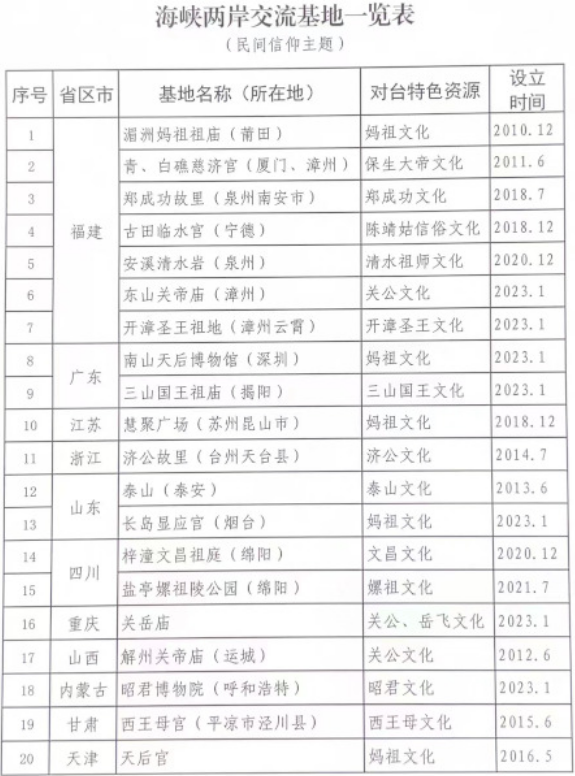 2009年至今,国台办已先后批准在山东、湖北、福建等24个省区市设立了91个海峡两岸交流基地。值得注意的是,这其中涉及民间信仰的交流基地有20个,占比超过20%,成为两岸民众文化交流的重要阵地。