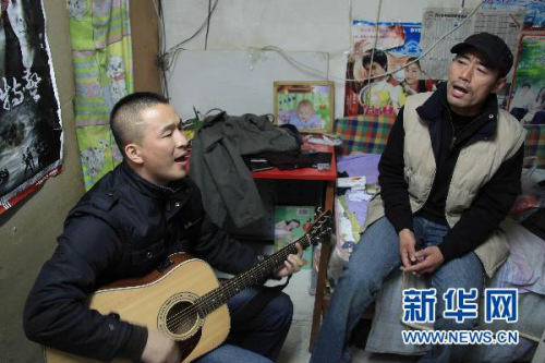 王旭(右)和刘刚在出租屋内唱歌。新华社记者 邢广利 摄