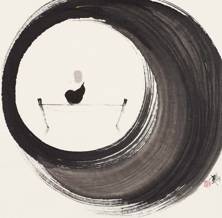 潘天寿说:“艺术之境,虽近在咫尺,辛苦一世,未必梦见。”古人把绘画分为神、逸、妙、能等不同的评论准则,只有符合了这些标准才能成为上品。然而仁者见仁,智者见智,人之雅俗格调各异,欣赏目的的不同也就影响了对作品的价值取向。如果真按这些条条归类沿袭,画画时不知如何下笔不说,只能耽误了正事。画画的过程也就是寻找自我状态的过程。有人说要达到天人合一,胸有成竹的境界,有些玄虚,那得看机缘和悟性。我画禅意水墨画,其实就像人们练瑜伽,瑜伽是什么不重要,中国的也好,印度的也好,反正它不像体操那样需要很好的筋骨功夫,也不像武术,刀枪棍棒,拳脚相加,少了一点斯文,更无需诵经礼拜,一心皈依。它只是身心轻松,舒展自如,在韵律节奏中体悟心境的恬淡闲适。周思聪论创作时说:“我画画的最好状态,是自己拿着画笔不知到画啥,出来的东西最好。”什么样的状态决定了什么样的画品,而不是什么样的画品决定什么样的状态。
