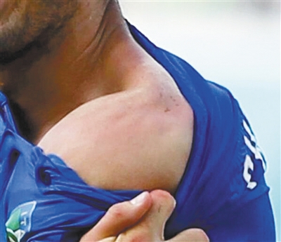 基耶利尼展示苏亚雷斯咬人留下的“齿印”,却换不来裁判的同情。