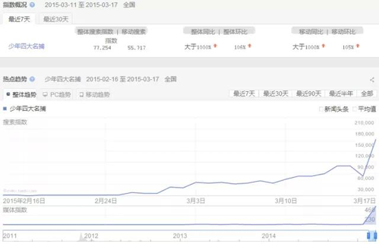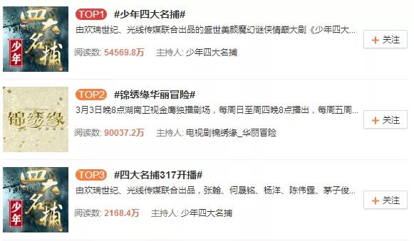 在《少年四大名捕》中,鱼塘主拼命耍酷,陈伟霆一直在卖萌,何晟铭画上邪魅的紫色眼影,貌似还有些秀基情……这哪里是电视剧,这分明是男神养眼视觉秀,《少年四大名捕》首播开篇打斗戏长达半小时,密集的特效运用令人应接不暇,被观众称赞具有复制《古剑》奇迹的潜质。在魔幻特效的加持下,画面显得行云流水、出神入化。优秀的剧情、完美的特技、加上养眼的面孔,怪不得《少年四大名捕》成为时下最火电视剧,没有之一。在首播后第一天的新浪微博电视剧话题榜上,前三位中居然有两个和该剧相关,第一名是#少年四大名捕#,第三名为#少年四大名捕317开播#。其中话题#少年四大名捕#已经取得5.5亿的阅读量和高达75.3万的讨论量(截至3月18日12时),而该剧百度指数上的表现,也可以反映出首播有多么万众期待,首播之后,一度接近18万的指数高位。
