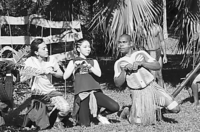 节目嘉宾(左)在伊斯坦布尔街头教当地人跳手绢舞 节目嘉宾在澳大利亚与当地土著人(右)互动