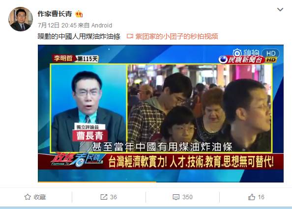 另一条新闻,是继“大陆人吃不起茶鸡蛋”之后,又有台湾学者大放厥词,称:“大陆人都很躁动,心理都不平衡,都好像精神有疾病”,“大陆的文化就是欺诈文化、造假文化”,“大陆人用煤油炸油条”。