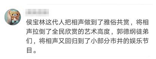 有网友直言:侯宝林这代人把相声做到了雅俗共赏,将相声拉到了全民欣赏的艺术高度,郭德纲徒弟们,又把相声回归到了小部分市井的娱乐节目。试想,如果一个艺人没有起码的艺德,心中没有基本的美丑标准,如何能做得到“雅俗共赏”?如何能不踩到观众厌恶的“雷区”?
