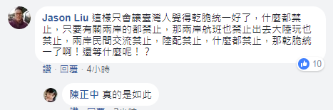 这就让很多台湾同学搞不懂了。于是,便有了本文开篇那个截自台湾脸书的台湾网友的留言,一位网友抱怨台当局“什么都禁止,干脆统一好了”,另一位深表同感地说“真的是如此”。