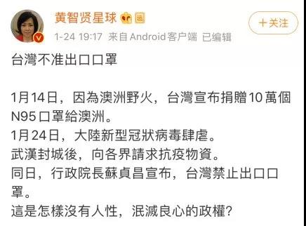 武汉疫情发生后,口罩成为防范病毒的重要保障,台当局“行政院长”苏贞昌却在此时有针对性地宣布“口罩禁止出口”。要知道,就在不久前的1月14日,因为澳大利亚野火,台湾宣布捐赠10万个N95口罩给澳大利亚。难怪岛内资深媒体人黄智贤痛批蔡当局是“泯灭良心的政权”!
