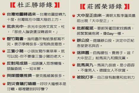 报道称,杜正胜在高雄主持一个教育局长会议时,心情显得不错,一时兴起还接过指挥棒,即兴指挥学生演奏乐曲。而庄国荣仍是高调的回应,还瞪大眼睛说,“自己在反蒋这一点上永远坚持到底。”