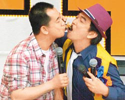 黄海波吃章鱼脚,吴宗宪(右)凑过去帮他,差点亲到嘴。