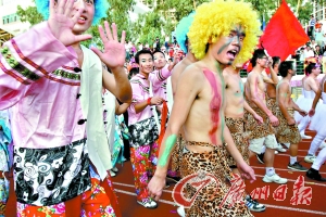 18日下午5时许,富士康龙华厂区D区,在彩车指引下,一个个由富士康员工组成的系列方阵开始巡游。由于是下班时间,活动吸引了众多员工驻足观看。参加巡游的员工们穿上各具特色的衣服,不同事业群的员工彰显出不同的个性。某事业群的员工小陈穿着一身“江南才子”的服装在音乐下与同事一起跳舞,虽然已经全身是汗,但是他觉得非常放松和快乐。“这就像国外的狂欢节一样,参与到其中就会感到很快乐。”