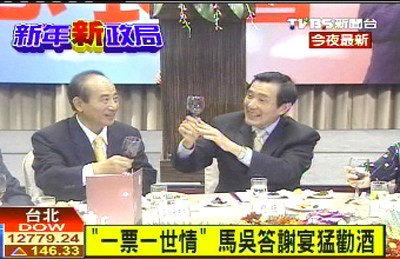 据台湾TVBS网站报道,马英九和吴敦义1日晚出席感恩餐会,答谢竞选干部在选战过程中的帮助,马英九深深三鞠躬表达感激,并说“一张票一世情”。不过,马吴二人真的太开心,吴敦义在现场猛劝酒,不知道是不是多喝了,马英九离开餐会的时候,讲话变得好轻柔。