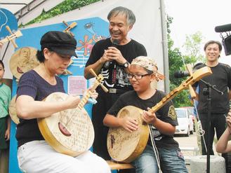 龙应台(左)7日到苗栗县桐花公园客家大院,为文化行动列车授旗,现场学弹月琴、唱恒春民谣。图片来源:台湾《联合报》