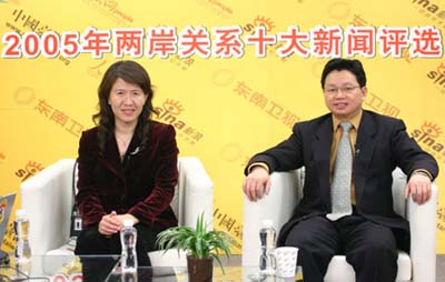 由中国台湾网、人民网、新浪网、东南卫视联合推出的“2005年两岸关系十大新闻”评选活动于2006年1月1日正式启动。作为评选活动的重要组成部分,1月17日13时至14时,全国台联联络部部长、前全国台联研究室副主任、全国台湾研究会理事杨毅周教授(右),社科院台湾研究所政治研究室主任谢郁(左)就台商春节包机、送台六项大礼等问题接受在线访谈。