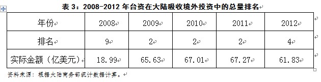 表3:2008-2012年台资在大陆吸收境外投资中的总量排名
