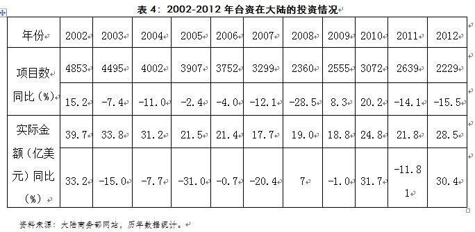 截至2012年12月底,大陆累计批准台资项目88001个,实际利用台资570.5亿美元。按实际使用金额统计,台资在大陆累计吸收境外投资中占4.5%。根据入世11年来(2002-2012年)的数据统计,台资在大陆的投资项目数量呈下降趋势,特别是2011年和2012年,同比分别出现了14.1%和15.5%的降幅;同时,台资在大陆投资的实际金额基本保持了上升趋势,出现了规模上升、项目数减少的情况,可见,台商在大陆的投资中大中型项目的数量有所增加。