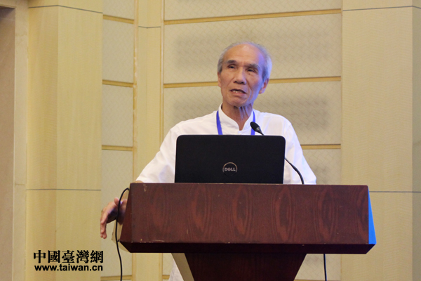 台湾大学政治学系名誉教授张麟徵发表主题演讲。(中国台湾网 张洁 摄)