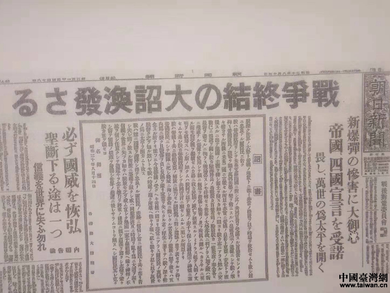 当然,《终战诏书》毕竟宣布“接受联合公告(按,指美、英、中、苏四国联合的《波茨坦公告》)”、承认“排斥他国之主权、侵犯他国之领土”的战争罪行。同日,日本天皇在“御前会议”宣读了《终战诏书》(图一、图二);日本《朝日新闻(图三)》、台湾《台湾新报》(图四)报道了日本天皇宣布投降的消息并刊登其《终战诏书》。