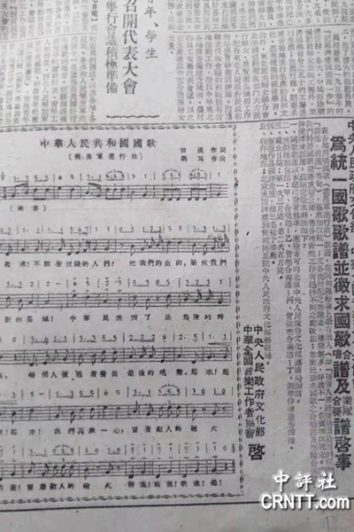 1950年3月9日《人民日报》第二版刊登《中央人民政府文化部、中华全国音乐工作者协会为统一国歌歌谱并征求国歌合唱谱及乐队合奏谱启事》(图二)。其文谓:“查各地所唱国歌(义勇军进行曲)歌谱,在词句与节奏上颇有出入(如‘每个人被迫着发出最后的吼声’‘前进,前进’等句),亟应加以统一;又各地所配之乐队谱,种类繁多,好坏不一,亦须加以规定。因此,我们特将国歌歌谱重新公布,希各地音乐工作者迅将不同之处改正;并广泛征求国歌之合唱谱及乐队合奏谱,以便择优采用。兹制定征求办法如下:一、国歌歌谱以本部印发者为准,各地应征者可向北京中央人民政府文化部艺术局函索;二、应征种类包括:甲、合唱谱;乙、乐队合奏谱;丙、管弦乐合奏谱;丁、钢琴伴奏谱等四种。三、截止日期:第一次三月底,第二次五月底;四、应征作品经评定后,前三名给予奖励;五、收件地点:北京市四牌楼头条胡同五号中央人民政府文化部艺术局。中央人民政府文化部、中华全国音乐工作者协会启”。