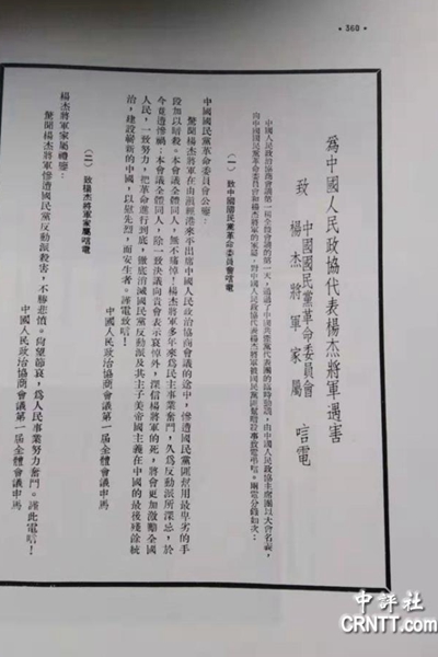图一,《中国人民政协为杨杰遇害致唁电》(来源:汪毅夫提供)