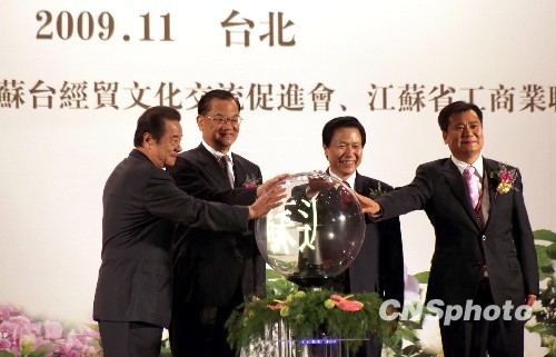11月10日,中共江苏省委书记梁保华、中国国民党荣誉主席连战等在台北为“台湾江苏周”暨首届台苏经贸合作论坛揭幕。(图片来源:中新社)