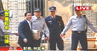 3月19日是319枪击案届满6年的日子,同时台湾“高院”审理的陈水扁案也在当天迎来重头戏:陈水扁家人首度共同应讯。图为陈水扁进入法院。(图片来源:台湾TVBS电视台)