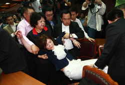 8月17日,台湾“立法院”开始召开第二次临时会。为了尽可能避免出现类似第一次临时会定时器砸伤国民党“立委”吴育升的流血事件,民进党主席蔡英文不得不亲自督军参加头一天谈话会。结果,当日民进党团在18项修正动议被否、民进党全体退席以示抗议的情况下,“立法院”临时会处理ECFA协议文本,最终以68票赞成,零票反对,零票弃权顺利通过。