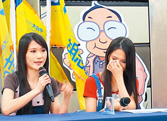 双胞胎姐妹陈珮瑜(左)、陈珮涵,为挺胡志强自拍音乐影片,惨遭恶搞影射成酒店小姐,泪洒记者会场。