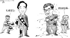 2007年11月,扁当局不顾岛内各界的普遍反对,坚持要将“大选”和“公投”捆绑进行、让“立委”和“公投”采取一阶段领票,这算什么招?这明明在告诉人们:“中选会我家开,游戏规则由我定,不服别来玩儿”。至于这样的游戏规则是否践踏了“公平、公义”,会不会导致投票场面混乱和选举争议,他们才不关心呢。有人想拒绝?“行政院”除了有“罚则”,还有针对个人的狠招——不听话的公务员小心退休金泡汤;扁把话说得更直接:“搞怪的县市,全部来宣布选举无效”,还威胁说:“郝龙斌你好胆、有本事,票不让我领,我当‘总统’不是当假的。”绿营内甚至传出了要扁宣布“戒严”的声音。岛内媒体将扁当局的表现比作“黑社会老大作派”,可就算是黑社会老大,也未必敢把这样惹众怒的事情做得这般赤裸裸吧? |
